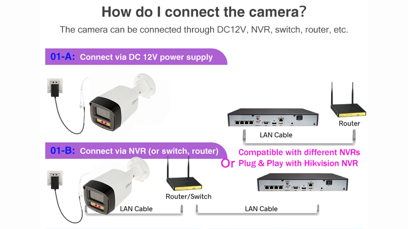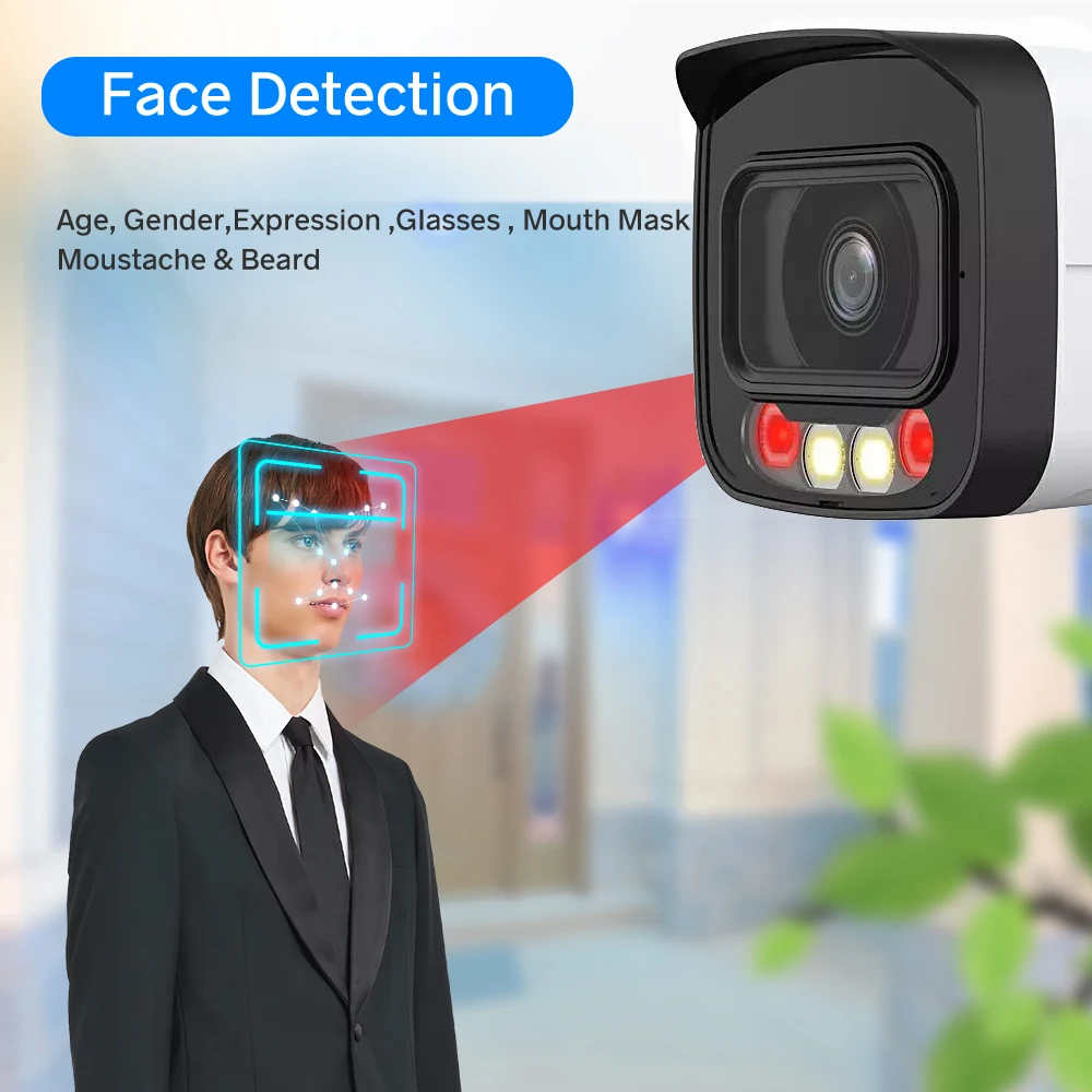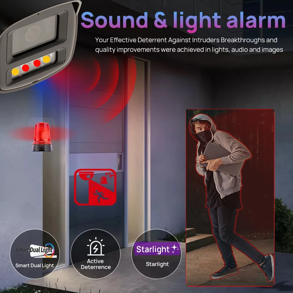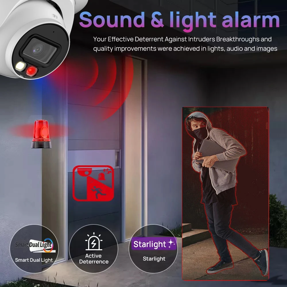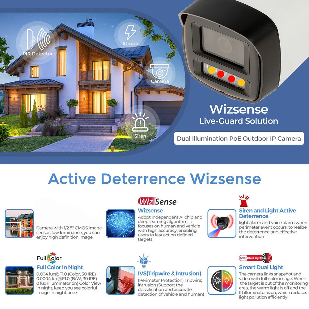 > Built-in IR LED and warm light, and the max. IR illumination distance is 30 m, the max. warm light distance is 30 m.