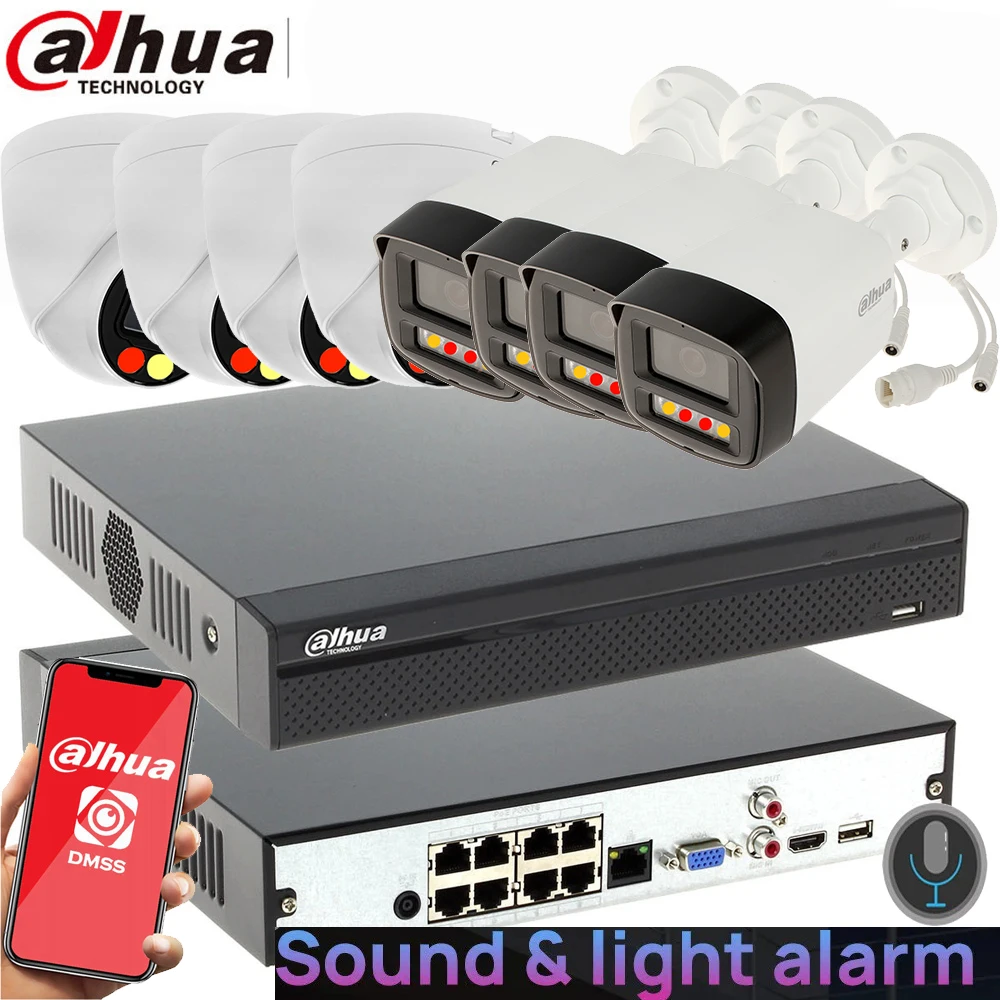 Mutil language dahua 8ch POE NVR kit with full color 4MP POE IP camera IPC-HFW2449TL-S-PV IPC-HDW2449T-S-PV sound alarm kit